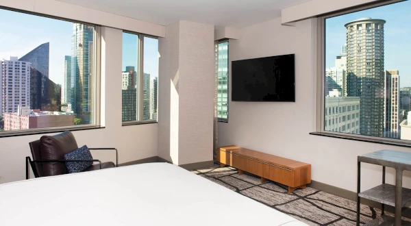 A modern hotel room features a large bed, a desk with a chair, a flat-screen TV, and a view of city buildings through a large window.
