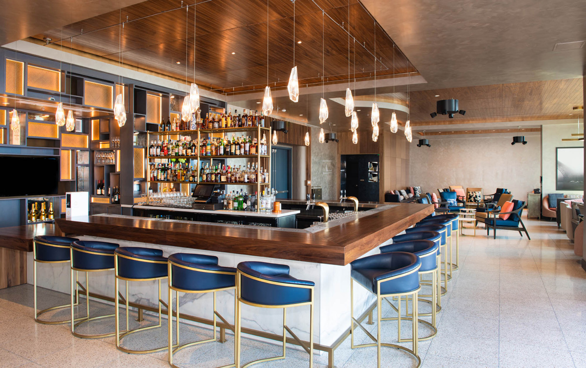 A modern bar with blue bar stools, high shelves with various bottles, hanging pendant lights, and a seating area with couches and chairs in the background.