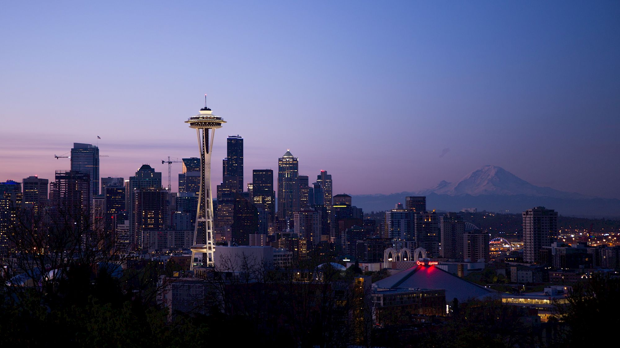 This is a twilight view of Seattle’s skyline, showcasing the Space Needle and Mount Rainier in the background, with city lights starting to twinkle.